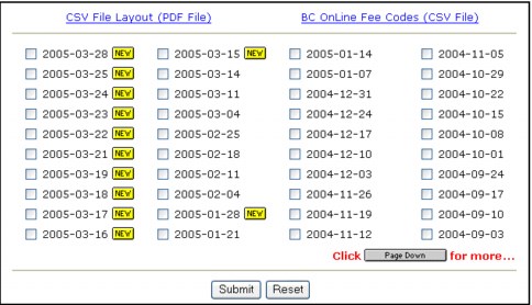 Generating a CSV file is very similar to generating a standard statement formatted for printing. From the BC OnLine main menu, select Account Management and click Submit to go to the Account Management menu.From the Account Management menu, select Download CSV File and click Submit to go to the CSV Selection List (shown below).You can click CSV File Layout to view a PDF file explaining the file’s layout, or BC OnLine Fee Codes to download all of BC OnLine’s fee codes.Select one statement CSV file from the list, then click Submit. Within a few minutes, your statement CSV file will be generated and delivered to your User Mailbox.